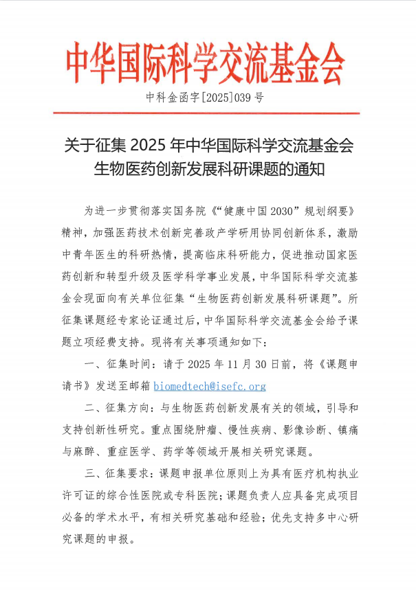 关于征集2025年中华国际科学交流基金会生物医药创新发展科研课题的通知