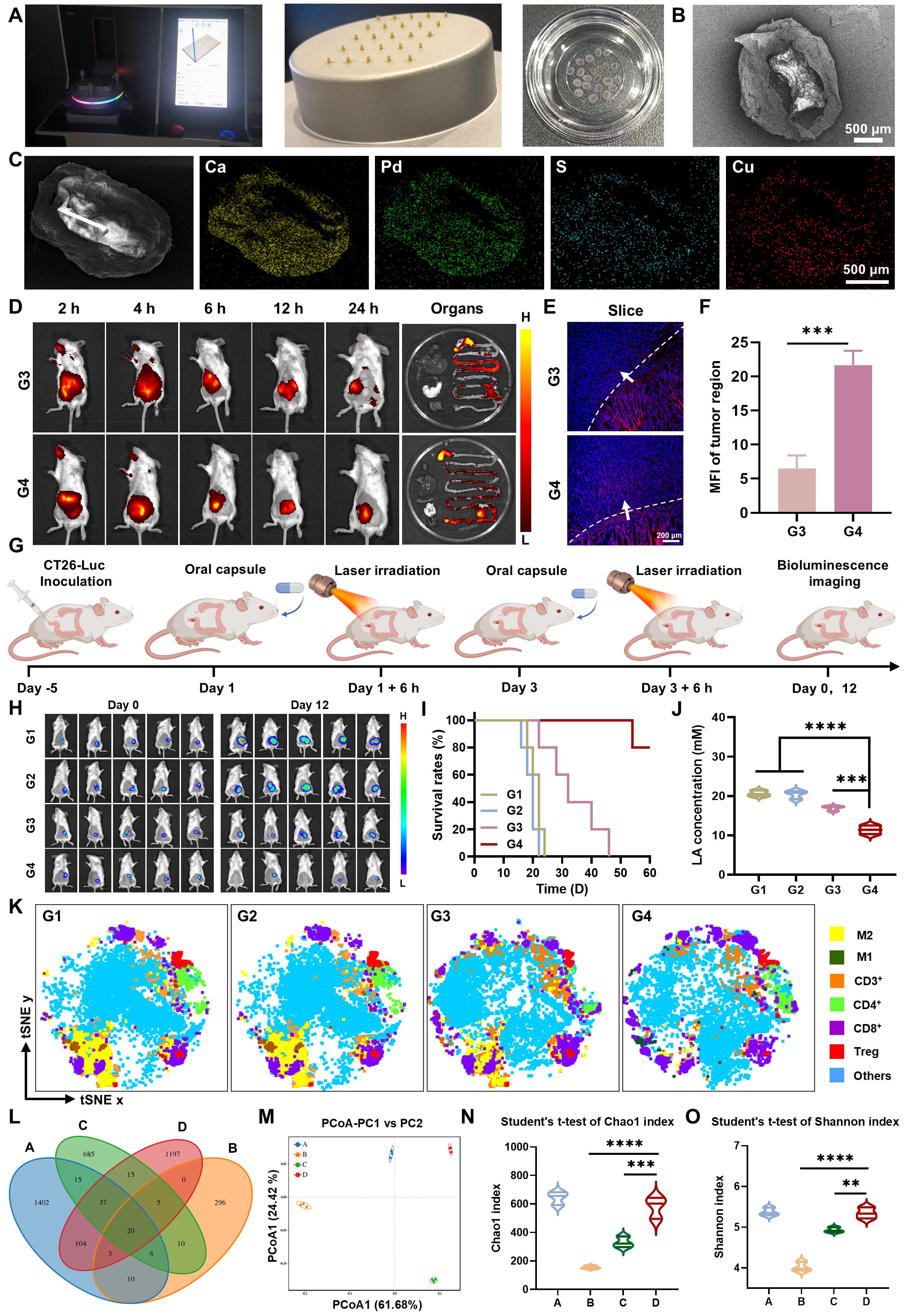 值得注意的是,该团队还开发了口服递送策略,以提高治疗的适用性。通过3D打印和光固化工艺,构建了由明胶甲基丙烯酰化物(GelMA)核心与海藻酸钙外壳组成的肠溶微胶囊。该胶囊能够在胃液环境下保持稳定,在肠道条件下实现可控释放,既保护了纳米机器人免受胃酸破坏,又帮助其跨越肠道黏液屏障,从而高效到达肿瘤病灶。动物实验进一步验证了口服纳米机器人胶囊的疗效,其在结直肠癌原位模型中表现出与静脉注射相当的肿瘤抑制作用,同时有助于恢复肠道菌群的多样性。