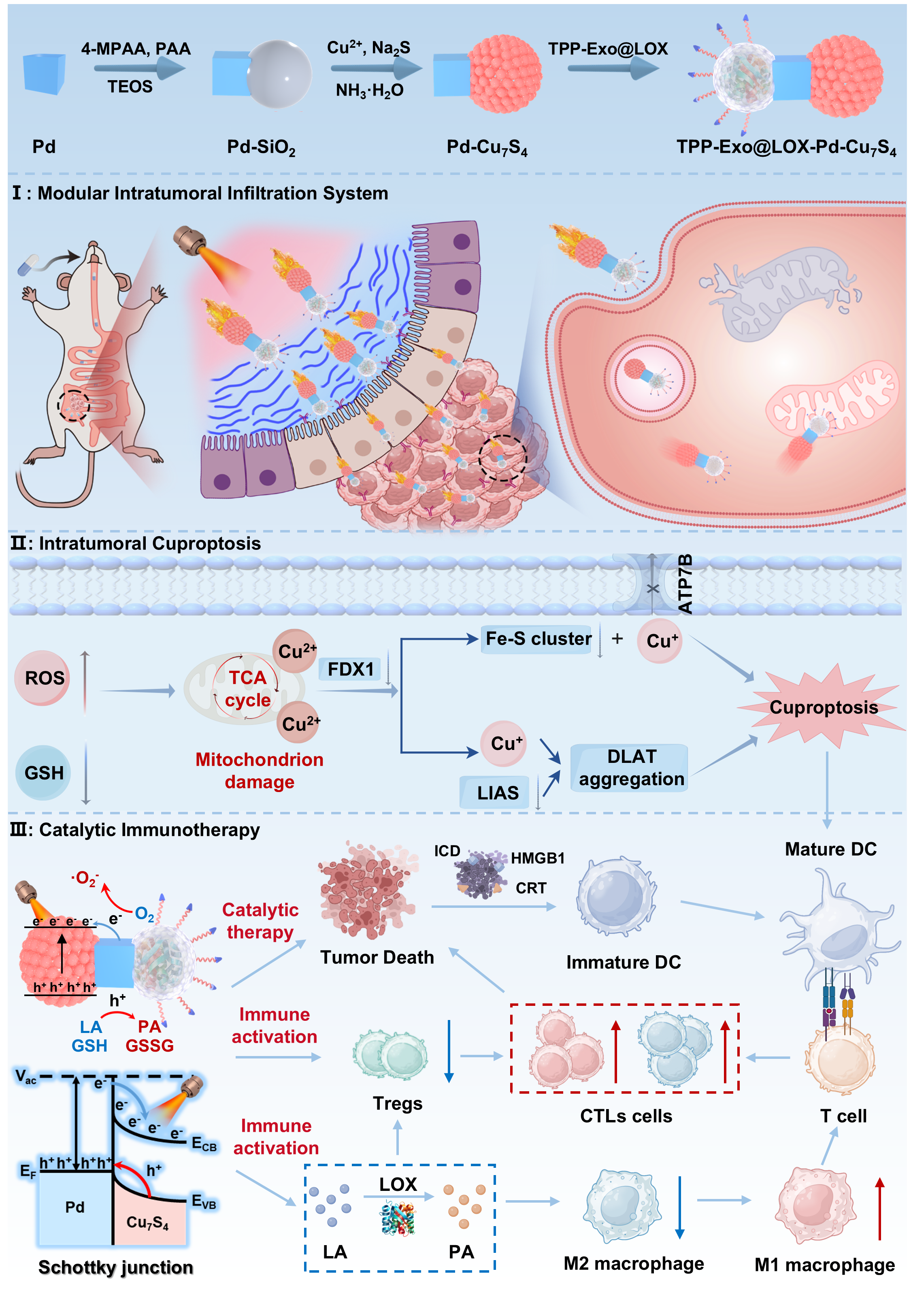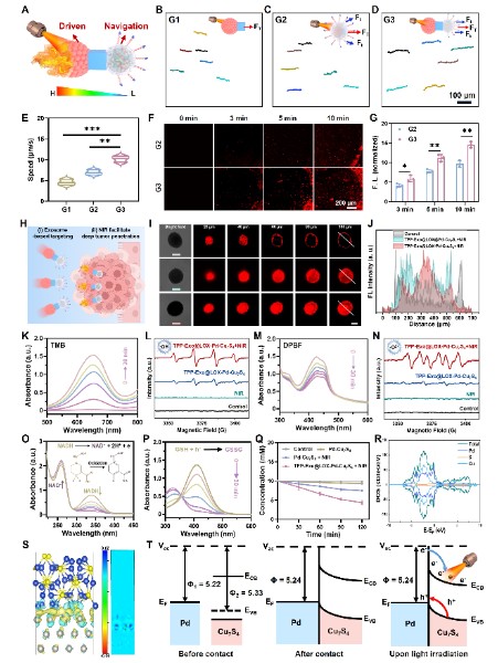 在这项工作中,天津大学姬晓元教授团队提出并制造了一种新颖的列车式纳米机器人系统。该体系借鉴列车编组的功能分工理念,通过合理的模块组合,实现了对结直肠癌的精准靶向、深层渗透、多模态催化与免疫代谢重塑的协同作用,为复杂实体瘤的综合治疗提供了新的策略。这类纳米机器人由三部分模块组成,各司其职而又紧密协作:中性粒细胞来源的外泌体被设计为车头,具备炎症趋化和肿瘤靶向能力,并在表面修饰三苯基膦,实现对肿瘤线粒体的精准定位;Pd-Cu7S4异质结构成车体,在近红外光照下分离电子和空穴,从而高效产生活性氧并伴随谷胱甘肽耗竭和NADH氧化,直接破坏肿瘤细胞的氧化还原平衡,同时,该过程促进铜离子在线粒体内的聚集诱发铜死亡;Cu7S4非对称结构则充当车尾,在近红外光照下形成温度梯度,从而产生热泳驱动,为纳米机器人提供主动推进力,使其能够突破致密基质屏障并深入肿瘤核心区域。该设计的最大创新性在于靶向牵引力与光驱推动力的直线性整合,实现了能量最大化利用,为体内物理屏障跨越和实体瘤深层渗透提供最大动力。