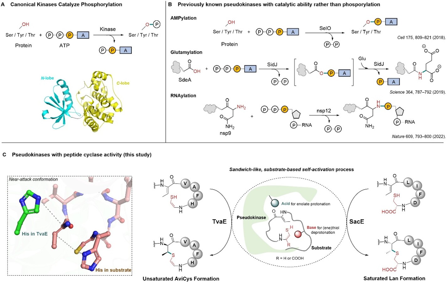 Wen Liu and his team reported a breakthrough in enzymology and natural product biosynthesis. Pseudokinases, long considered inactive, are now shown to catalyze peptide cyclizations through thioether crosslinking. The integration of structural biology, mutagenesis, and computational chemistry revealed a novel ‘sandwich-like substrate-assisted mechanism.’ This discovery redefines pseudokinases as true biocatalysts and offers new tools for cyclic peptide synthesis.