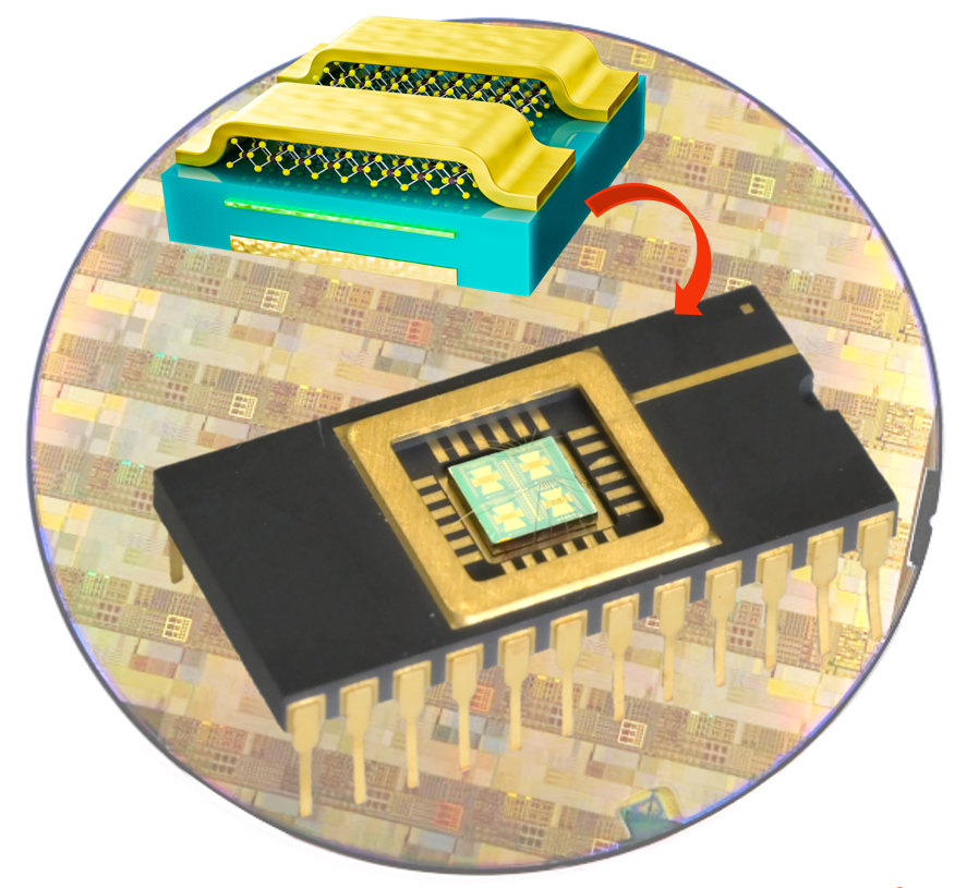 团队针对性地研发了原子芯片(ATOM2CHIP)系统集成框架。就像拼乐高积木一样,他们通过模块化集成方案,将二维存储电路与成熟CMOS电路分离制造,最后与CMOS控制电路通过高密度单片互连技术实现完整芯片集成。