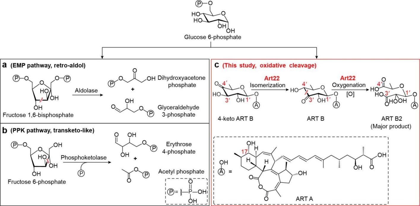 环烯酸菌素是一类具有独特6/7/8/5四环结构的多烯聚酮类天然产物,对革兰氏阳性菌表现出显著的抗菌活性。科研人员发现,金属异构酶Art22具有典型的TIM桶状结构,可催化己酮糖异构化反应,并依赖过渡金属离子活化氧气,通过酸酐中间体,实现己糖氧化断裂并伴随CO2释放。同时,Art22可在同一催化中心依次完成异构化与氧化裂解两步反应,并在细菌内发挥双重生理功能,即一方面通过异构化促进杀菌活性分子的生成;另一方面通过氧化裂解作用使微量毒性产物失活,从而实现“进攻”与“防御”的动态平衡。