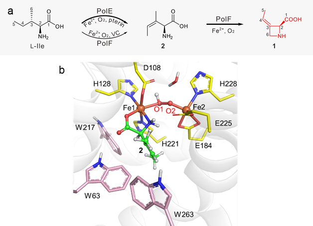 图1:a.聚肟酸的生物合成路径;b.去饱和异亮氨酸与PolF酶配位结构。