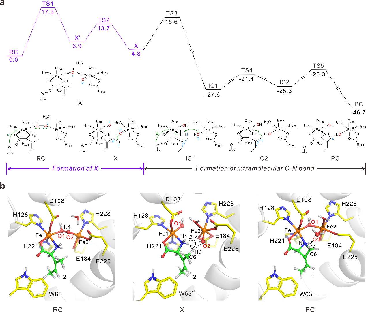 图2:PolF的催化机理研究。a.通过QM/MM计算获得的PolF催化底物2发生分子内环化反应生成产物1的势能面(kcal/mol);b. PolF催化底物2生成产物1的分子内环化反应中涉及的关键中间体结构。