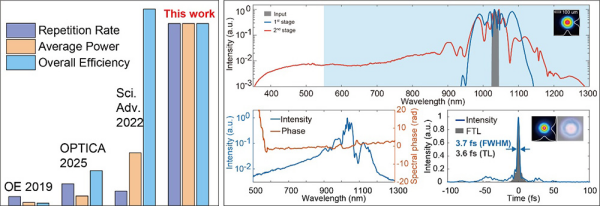 不同单周期脉冲压缩方案的关键指标对比(左),超连续白光光谱展宽(右上),接近变换极限的单周期飞秒脉冲压缩结果(右下)