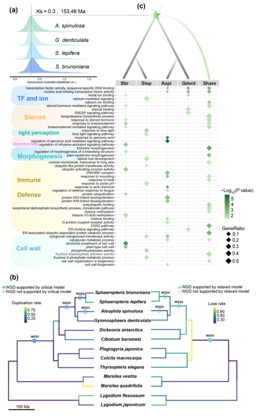 结果发现,在整体分子进化速率相对缓慢的背景下,整个树蕨谱系仅在约1.54亿年前共享一次全基因组复制(WGD)事件。该事件赋予了树蕨双重适应优势,不仅赋予了祖先树蕨对侏罗纪晚期环境剧变的适应能力,也为后期物种多样化提供了遗传基础。典型树形物种优先保留与细胞壁合成、木质化相关的基因,以强化支撑结构。而非树形物种则更多保留代谢与防御相关基因,从而增强生存韧性。