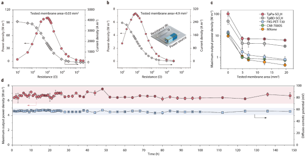 在5M/0.5 MNaCl浓度梯度下,由于COF通道内的德拜长度(λD)不重合,因此该膜不具备电荷选择性,Na+和Cl-的渗透测试进一步验证了这一结论。此外,扩散-渗透电流与活度比的对数呈线性关系,表明扩散-渗透机制主导了盐差能转换过程。此过程中,COF致密分布的磺酸基团提供了高电荷密度,增强了电双层内界面渗透压梯度,从而能有效产生扩散-渗透流,结合其垂直排列的一维孔道,能高效驱动离子输运。该方法避免了传统RED对膜选择性的依赖,克服了“通量-选择性”博弈和浓差极化等问题。在0.03mm2测试面积下,实现了101.2Wm-2的最大功率密度,显著高于多数已报道材料。当膜面积放大两个数量级(~20mm2),功率密度仍能维持在~7Wm-2。