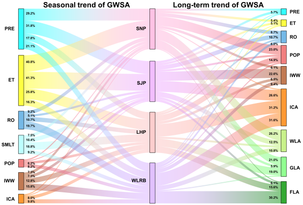 中国科学院东北地理与农业生态研究所研究人员利用高空间分辨率GRACE重力卫星数据,反演获取东北黑土区地下水储量动态数据。研究人员在解析其变化时空规律后,运用时间序列分解和随机森林回归模型,识别并量化自然因素、人类活动对重点区域地下水储量变化季节及长期趋势变化的驱动因素与贡献程度。