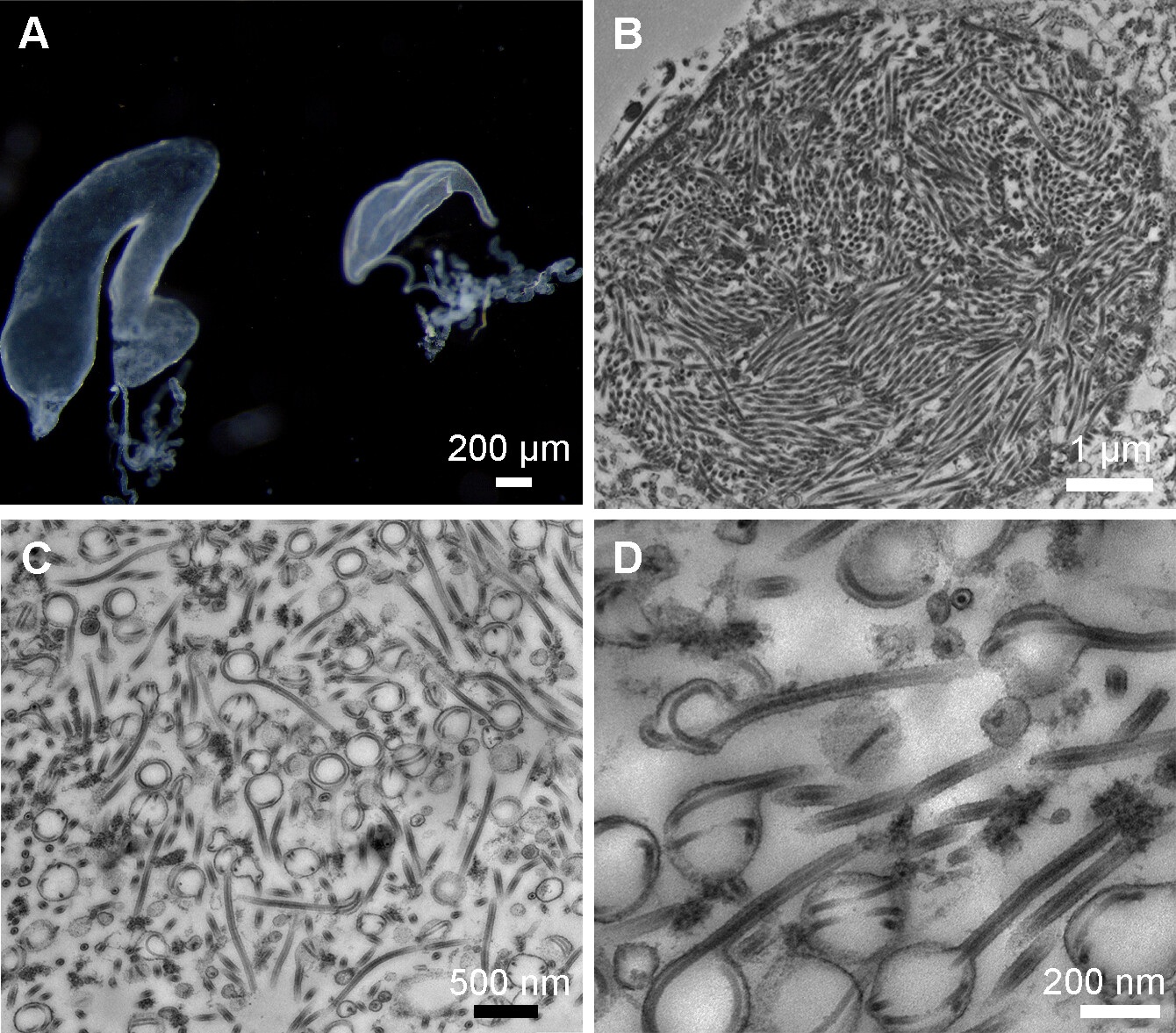 大型双链 DNA病毒在昆虫中具有广泛的宿主范围,但其对蚂蚁的感染迄今尚未见报道。团队从日本弓背蚁小工蚁肿大的下唇腺中,鉴定出一种新型丝状病毒,并将其命名为日本弓背蚁唇腺疾病病毒(CjLGDV)。透射电子显微镜观察显示,受感染的下唇腺细胞核内存在大量无包膜核衣壳,细胞质内则存在包膜形成中间体。
