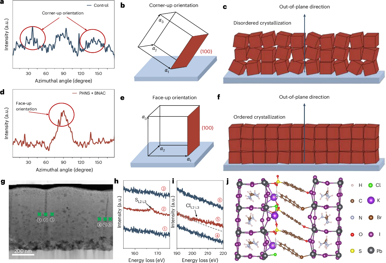 针对上述挑战,华中科技大学武汉光电国家研究中心陈炜-刘宗豪团队创新性地提出了一种基于芳香相互作用协同调控的双分子添加剂晶体调控策略。研究团队选取了两种含有萘环的分子:6-羟基-2-萘磺酸钾(PHNS)和6-溴-2-萘胺盐酸盐(BNAC),协同作用于钙钛矿结晶过程。其中,PHNS中的羟基和磺酸基团可与Pb2+离子配位,而BNAC中的铵阳离子则可占据FA+位点。尤为关键的是,两个分子中的萘基在[PbI6]4−八面体旁形成紧密的芳香堆积结构,从而诱导晶体沿(100)晶面择优面外取向生长。这种高度有序的生长模式减少了晶界数量,提升了薄膜的整体晶体质量(图1)。核奥弗豪泽效应光谱和横截面TEM相应的电子能量损失光谱分析表明了芳香堆积结构是诱导特定取向生长的关键(图2)。此外,芳香相互作用还增强了对钙钛矿薄膜中不同类型缺陷的协同钝化效果,显著降低薄膜缺陷密度(图3)。