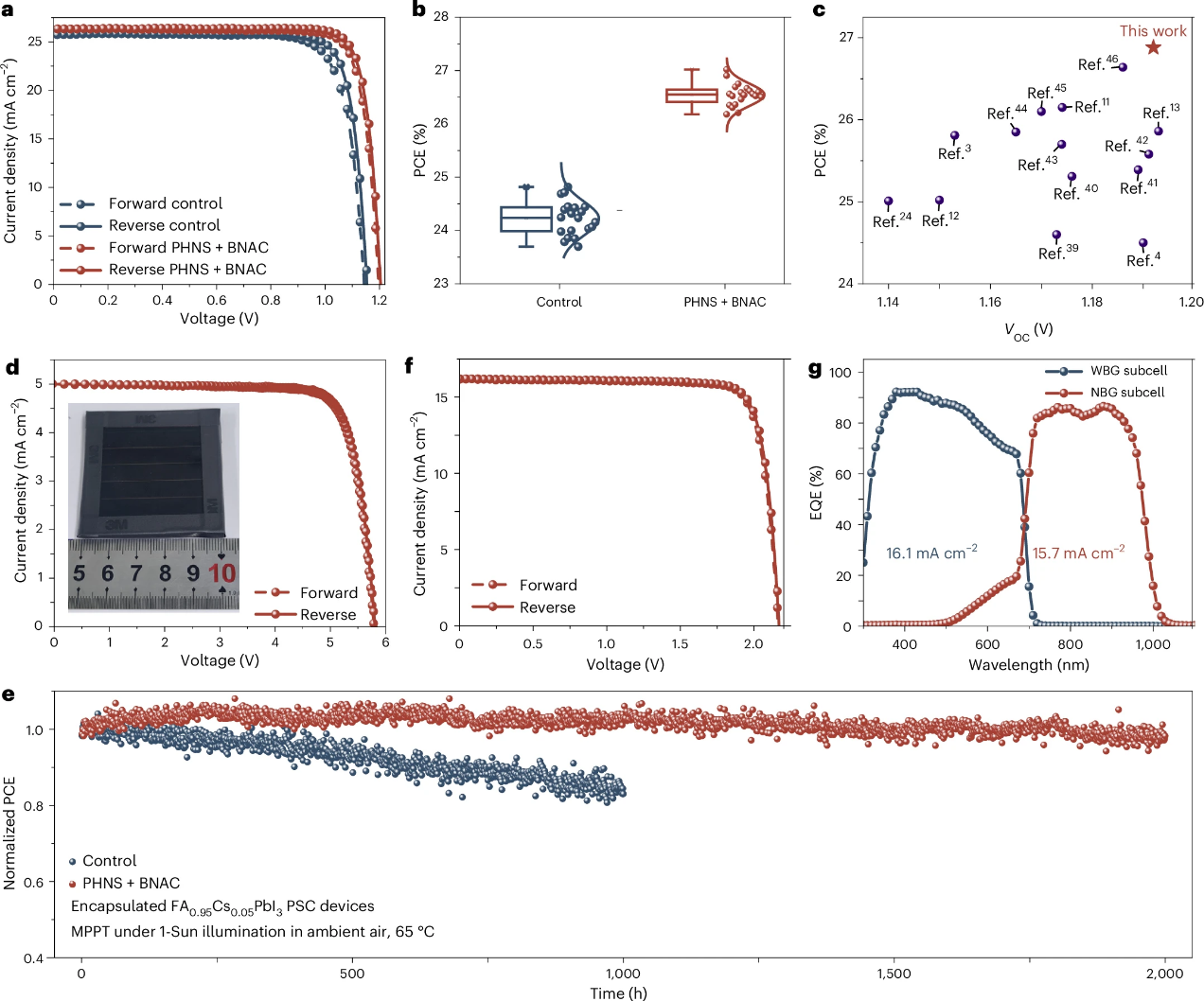 基于该双分子策略制备的反式钙钛矿太阳能电池实现了27.02%的光电转换效率(认证效率达26.88%),是目前已报道的单结器件最高效率之一(图4)。器件同时展现出良好的稳定性,在连续工作2000小时后仍能保持初始效率的98.2%。此外,研究团队制备的孔径面积为11.09 cm2的反式微型组件实现了23.18%的认证稳态效率。将该策略拓展至窄带隙钙钛矿体系后,同样具备诱导面外择优取向性的效果,基于此制备的全钙钛矿叠层太阳能电池则实现了29.07%的认证效率。