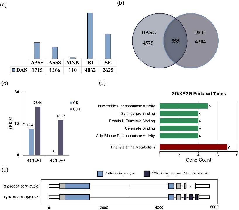 借助构建的转录本数据库,研究团队还发现了低温胁迫下的独特调控机制:低温可特异性诱导4-香豆酸辅酶A连接酶基因(Sg4CL3)上调表达,并触发外显子跳跃事件,导致AMP结合酶功能结构域缺失;同时低温显著增加Sg4CL3基因的甲基化位点密度。研究人员推测:低温通过诱导Sg4CL3基因的复杂甲基化模式,同时调控前体mRNA的可变剪接加工与转录本稳定性,形成转录-可变剪接-表观修饰多层次协同的低温响应机制。