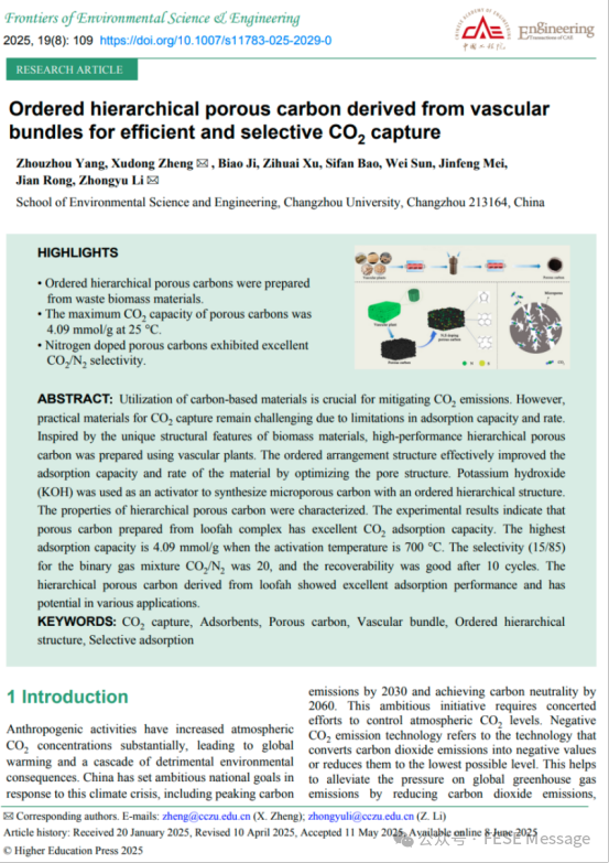本文内容来自FESE期刊2025年第19卷第8期发表的研究文章Ordered hierarchical porous carbon derived from vascular bundles for efficient and selective CO2 capture。通讯作者为常州大学环境科学与工程学院李忠玉教授和郑旭东教授。