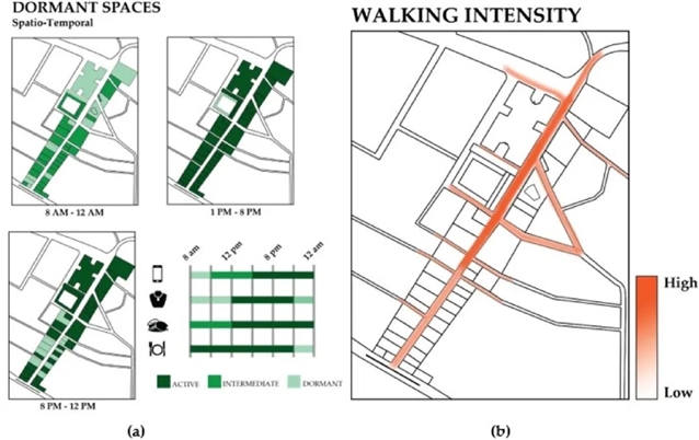 ▲ 图四:易读性分析:(a) 闲置空间;(b) 步行强度。©本文作者