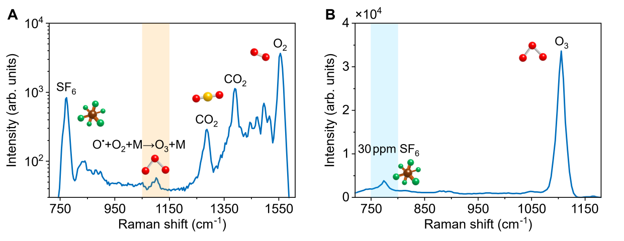 研究团队基于四次聚焦产生的泵浦光和空气激光,进一步发展了高灵敏的单光束相干拉曼光谱技术,实现了SF6、CO2、O2以及光丝中产生的O3等多种分子同时探测,且SF6气体最小探测浓度达到30ppm水平。