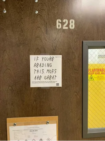 亚吉在实验室大门上贴了便签纸,意为“如果你读到这里,MOF是很棒的”。周子晖/摄
