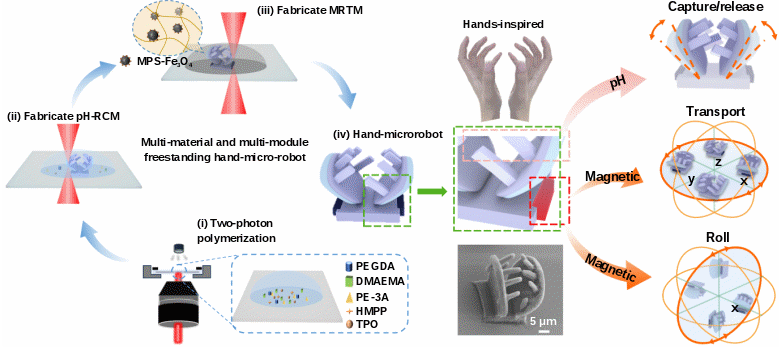 “快递员”3D手型微纳机器人由两种智能材料组成,顶部是pH响应模块,像个“感应夹子”,遇到特定酸碱环境就会自动开合;底部是磁驱动模块,像个“微型马达”,能用外部磁场远程控制它移动、旋转甚至翻转。