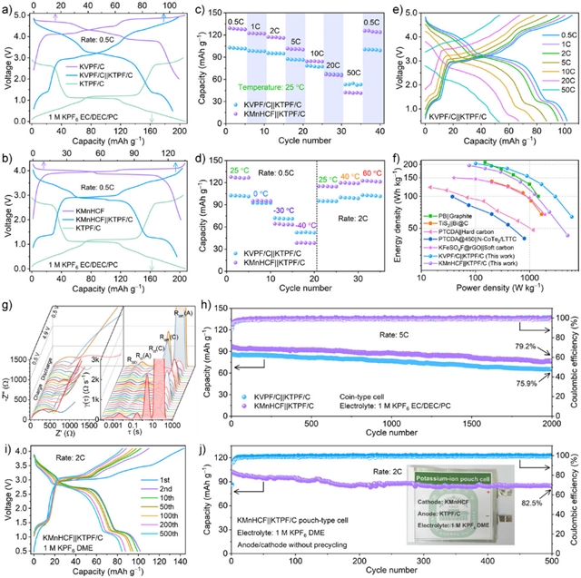 图3 全电池的电化学性能。a) KVPF/CKTPF/C和b) KMnHCFKTPF/C纽扣式全电池的典型充放电曲线。纽扣式全电池在c)不同倍率和d)不同温度下的比容量。e) KVPF/CKTPF/C纽扣式全电池在不同电流密度下的充放电曲线。f) 与不同钾离子全电池相比,KVPF/CKTPF/C和KMnHCFKTPF/C纽扣式全电池的Ragone图。g) KVPF/CKTPF/C纽扣式全电池的原位EIS谱和DRT分析。h) 5C下纽扣式全电池的循环稳定性比较。KMnHCFKTPF/C软包型全电池i) 在不同圈数的充放电曲线和j)在2C下的循环性能。j)的插图:KMnHCFKTPF/C软包电池照片。(来源:科学网)