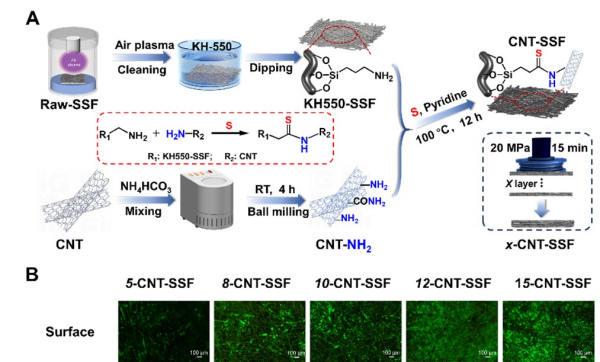 近期,中国科学院新疆理化技术研究所科研团队通过等离子体处理和浸渍法将硅烷偶联剂KH550接枝到不锈钢毡纤维表面,并利用硫磺基三组分偶联反应负载氨基化碳纳米管(CNT-NH2),成功制备了具有稳定疏水/亲油特性的功能性不锈钢纤维毡(CNT-SSF)。该材料表现出优异的疏水/亲油性能,可高通量高效分离多种油水混合物,并且展现出良好的重复使用稳定性。