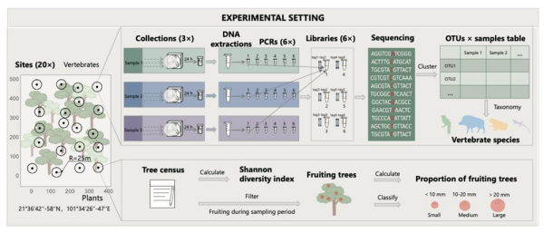 研究通过在样地内布设20台空气采样器,收集空气中的DNA,并通过高通量测序获取其中的脊椎动物遗传信息。在3轮为期6天的采样中,研究团队共检测到89种陆生脊椎动物,其中包括71种鸟类和18种哺乳动物。研究结果表明,样地内果树数量和果实大小对食果动物的空间分布具有显著影响:果实资源越丰富的区域,食果鸟类和哺乳动物的出现概率越高;尤其是小果树(果实直径小于10毫米)的分布,对小型鸟类和松鼠等小型哺乳动物的分布起着重要的驱动作用。相比之下,食肉动物的分布与果实资源并无明显关联。
