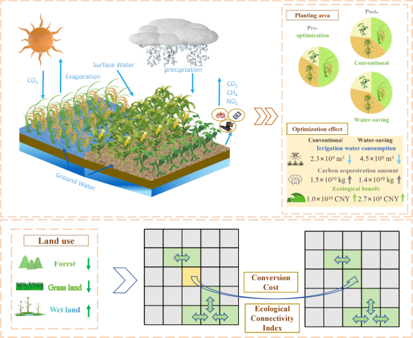 多维要素协同优化提升生态系统连通性研究获进展。农业快速扩张,对水资源供给造成压力,也侵占森林、草地和湿地等生态系统的生态用地,打破生态系统连通性,扰乱自然生态系统碳循环过程。水土资源优化配置要考虑粮食安全和生态安全,涉及水文、生态、农业、地理、经济等多个学科领域,也要考虑水资源和土地资源之间存在相互匹配与均衡的关系。因此,协调与权衡有限的水资源和土地资源,提升水资源利用效率,增加粮食生产能力,提高保护生态系统连通性,增强碳汇能力,是复杂的科学问题。