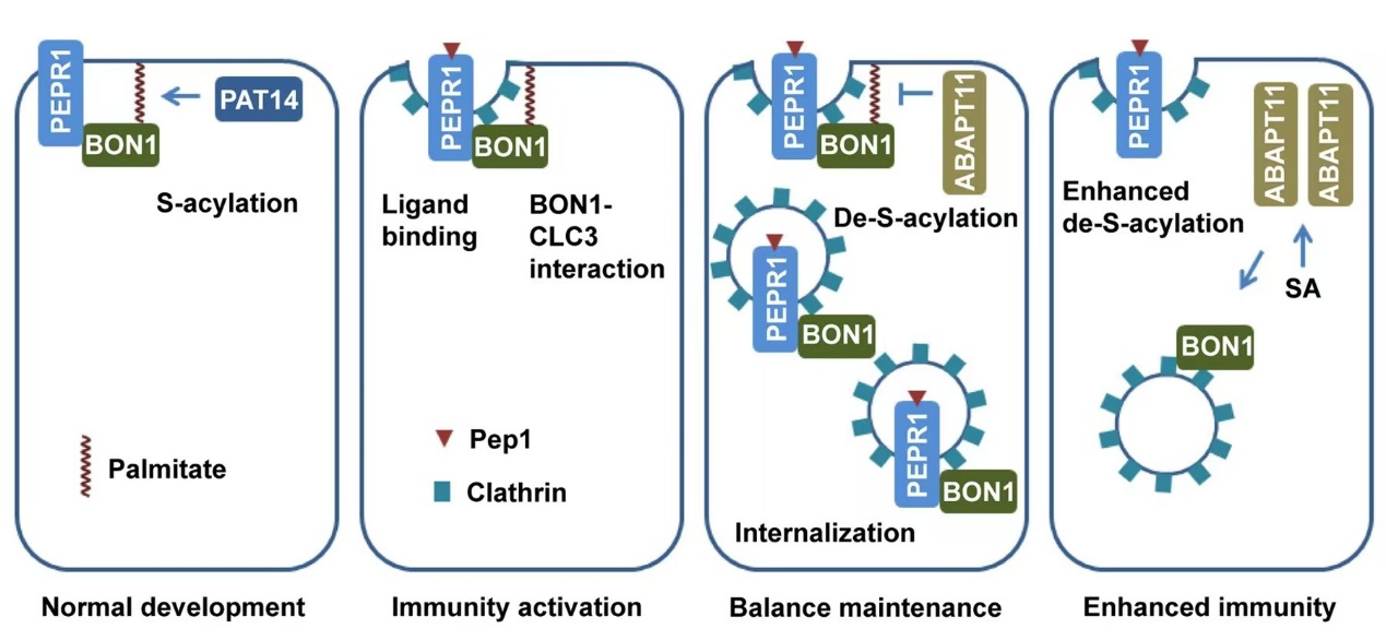 进一步的研究表明,生理水平的可逆棕榈酰化是植物细胞内吞和免疫受体内化所需要的。水杨酸增强了ABAPT11介导的BON1去棕榈酰化,从而放大了免疫信号。因此,BON1的可逆棕榈酰化通过调控内吞作用以维持植物发育与免疫的平衡。