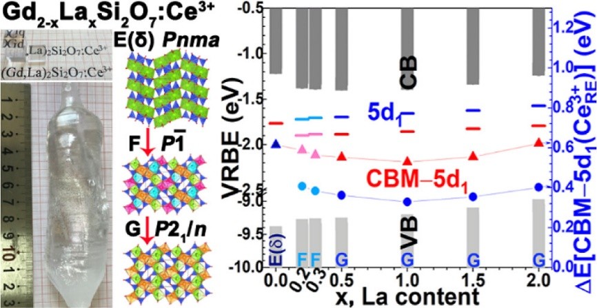 随着深地科学和油气资源勘探的深入发展,能适用于200?°C以上高温工况的闪烁探测材料成为技术瓶颈。(Gd,La)2Si2O7:Ce3+材料因其非潮解性、高光产额、可甄别多种辐射粒子等特性,近年来被视为极具潜力的候选材料。然而,其高温稳定的晶体结构类型、Ce3+在晶格中的占位及发光归属一直存在争议,阻碍了材料性能的进一步优化。