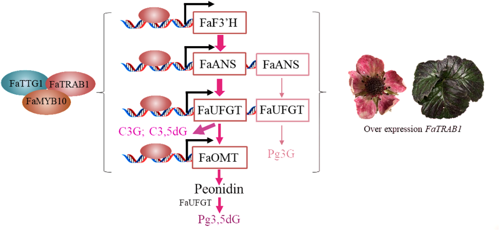 花青素是赋予果实鲜艳色泽、提升其市场与营养价值的核心物质,而FaTRAB1是一种能调控植物基因表达的bZIP转录因子。当FaTRAB1被打开时,它会与另外两个在果实着色中早已闻名的调控因子FaMYB10和FaTTG1结合,形成一个新型复合物,精准启动叶片的花青素合成程序,使原本绿色的叶片转变成紫红色。更有意思的是,FaTRAB1不是随便制造花青素,而是特异性促进了矢车菊素类衍生物的积累——主要包括:矢车菊素-3-O-葡萄糖苷(C3G),矢车菊素-3,5-O-二葡萄糖苷(C3,5dG)以及少量芍药素(Pg3,5dG)和天竺葵素(Pg3G)衍生物。