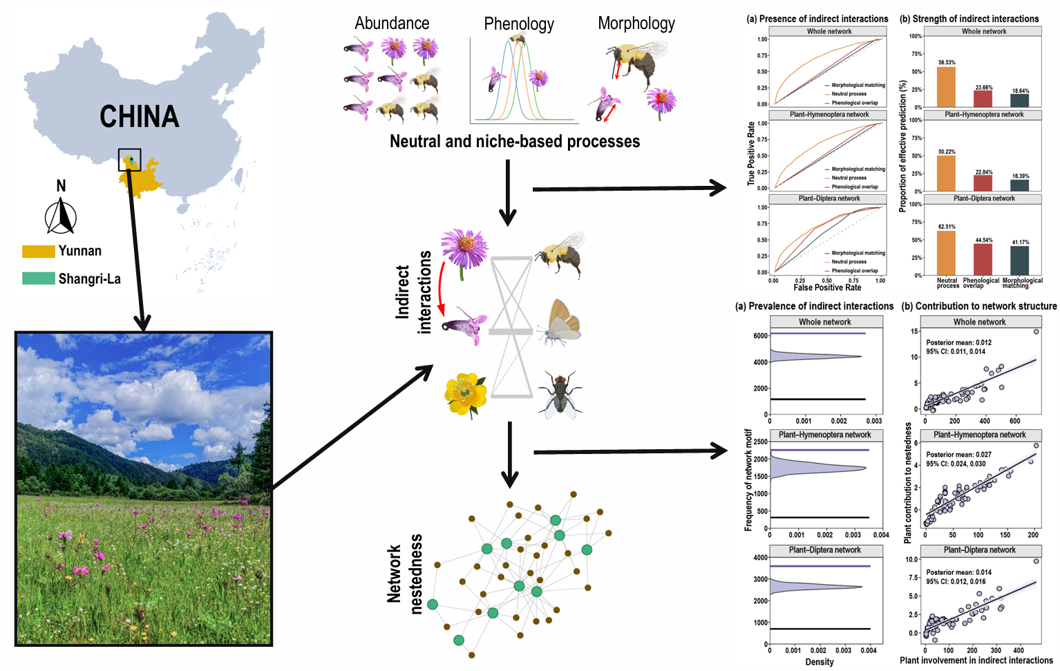 当同时考虑植物和传粉者特征时,研究发现,中性过程(由植物与传粉者丰度共同驱动)和生态位过程(植物与传粉者间的形态匹配和物候重叠驱动)均能有效预测植物间的间接相互作用,但中性过程的预测性能相对更强。这表明,在高山草甸中,“数量优势”通常比“完美匹配”更重要。