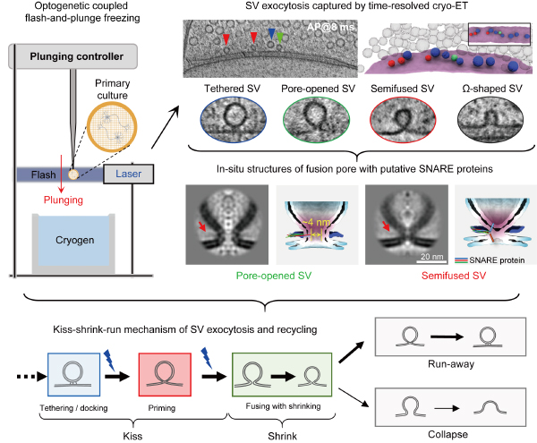 实验中,团队在神经元中表达光敏蛋白,通过激光精准激发动作电位,触发突触囊泡释放。此后,载有样品的电镜载网,在设定时间快速落入冷冻剂,将细胞瞬间固定。通过精确控制光照与冷冻的时间间隔,团队在4毫秒到300毫秒之间的时间释放样品,捕获了囊泡不同阶段的结构快照。
