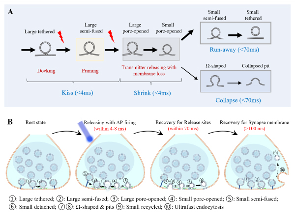 大脑功能的实现,依赖于数千亿个神经元之间高效、精准的突触传递。突触囊泡作为神经递质的载体,其释放机制是神经科学领域的重要问题。此前,科学界围绕囊泡释放机制,提出了“全融合”与“亲吻-逃逸”两种对立模型。但是,由于囊泡释放过程发生在毫秒时间尺度、结构变化处于纳米空间尺度,传统技术难以捕捉其瞬时动态,导致神经科学研究长期陷入困局。