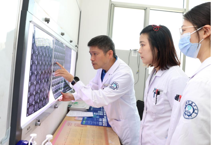 陈竹(左一)与团队成员在讨论患者病情。受访者供图