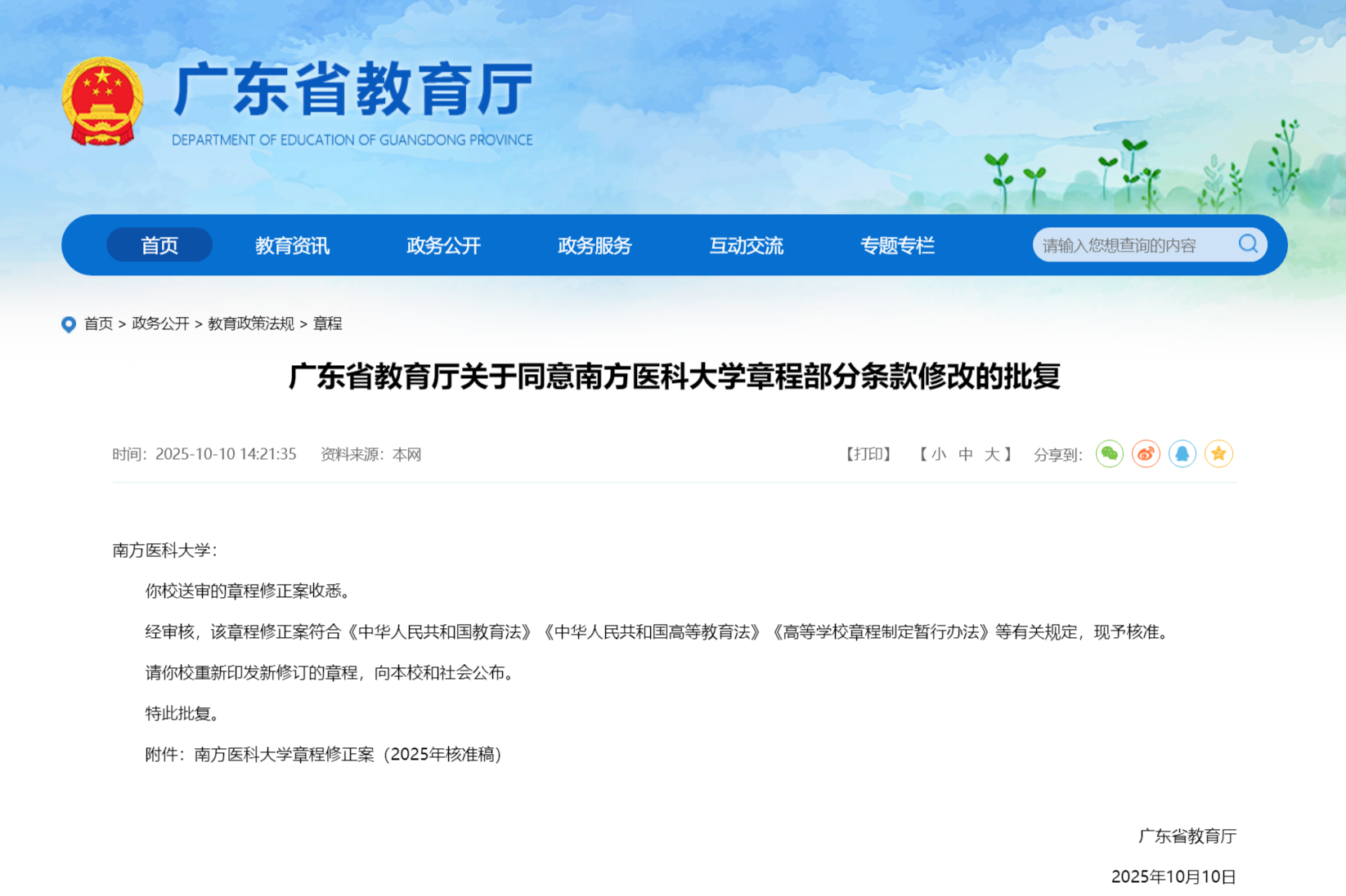 广东省教育厅关于同意南方医科大学章程部分条款修改的批复