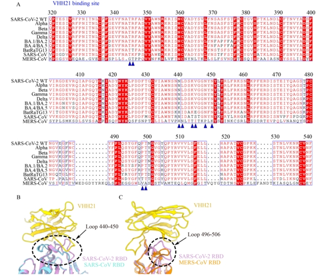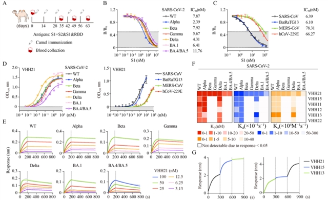 中国科学院生物物理研究所杨鹏远、章新政,同济大学医学院附属东方医院王海坤等报道了一种名为VHH21的纳米抗体,其能够通过催化刺突三聚体的不可逆构象变化实现快速破坏。研究发现,VHH21通过自发形成二聚体形式,靶向刺突蛋白上保守的新型表位,而非受体结合域的血管紧张素转换酶2结合位点,从而破坏病毒融合过程,展现出广谱结合能力和高效抗病毒特性。