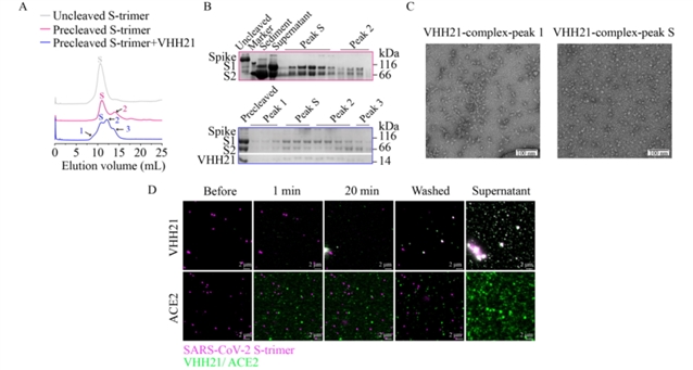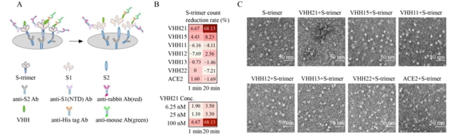 为获得具有广谱活性的纳米抗体,研究团队采用多抗原免疫策略,用包含全长刺突蛋白、刺突蛋白S1亚基及受体结合域的混合免疫原免疫双峰驼(图1)。随后构建了高质量的噬菌体展示VHH文库,通过酶联免疫吸附实验和生物层干涉技术筛选,获得了对多种冠状病毒刺突蛋白具有高亲和力的候选纳米抗体。其中,VHH21对所有关注变异株的S1蛋白均表现出纳摩尔级亲和力,且结合稳定性极高,10分钟内几乎无解离现象。功能筛选阶段,研究人员利用共聚焦显微镜建立的可视化超分辨率成像平台,将刺突三聚体标记为红色荧光,纳米抗体标记为绿色荧光,动态监测发现VHH21在20分钟内可破坏68%的刺突三聚体,显著优于其他候选抗体(图2)。负染色电镜进一步证实,仅VHH21能导致刺突三聚体完全解离,而其他抗体及血管紧张素转换酶2均无此效果。