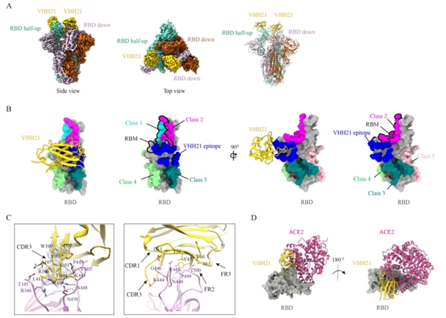 图4 VHH21与刺突三聚体结合的冷冻电镜结构