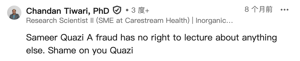 作为一名发表大量“学术不端”论文的人,Quazi的这番发言遭到网友的围攻:“骗子没有资格指指点点,你应当感到羞耻。”