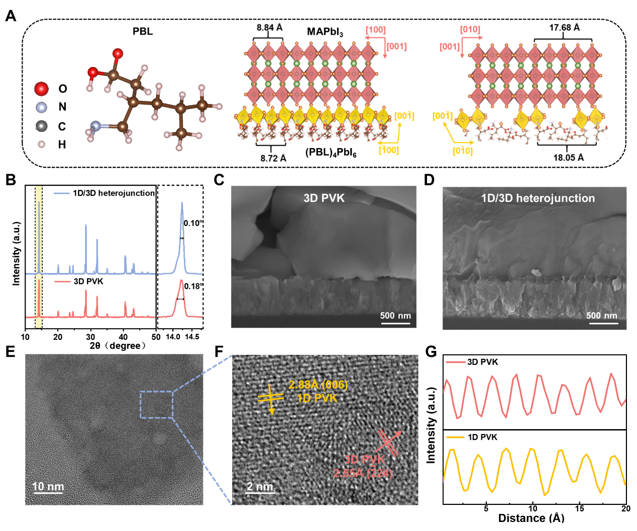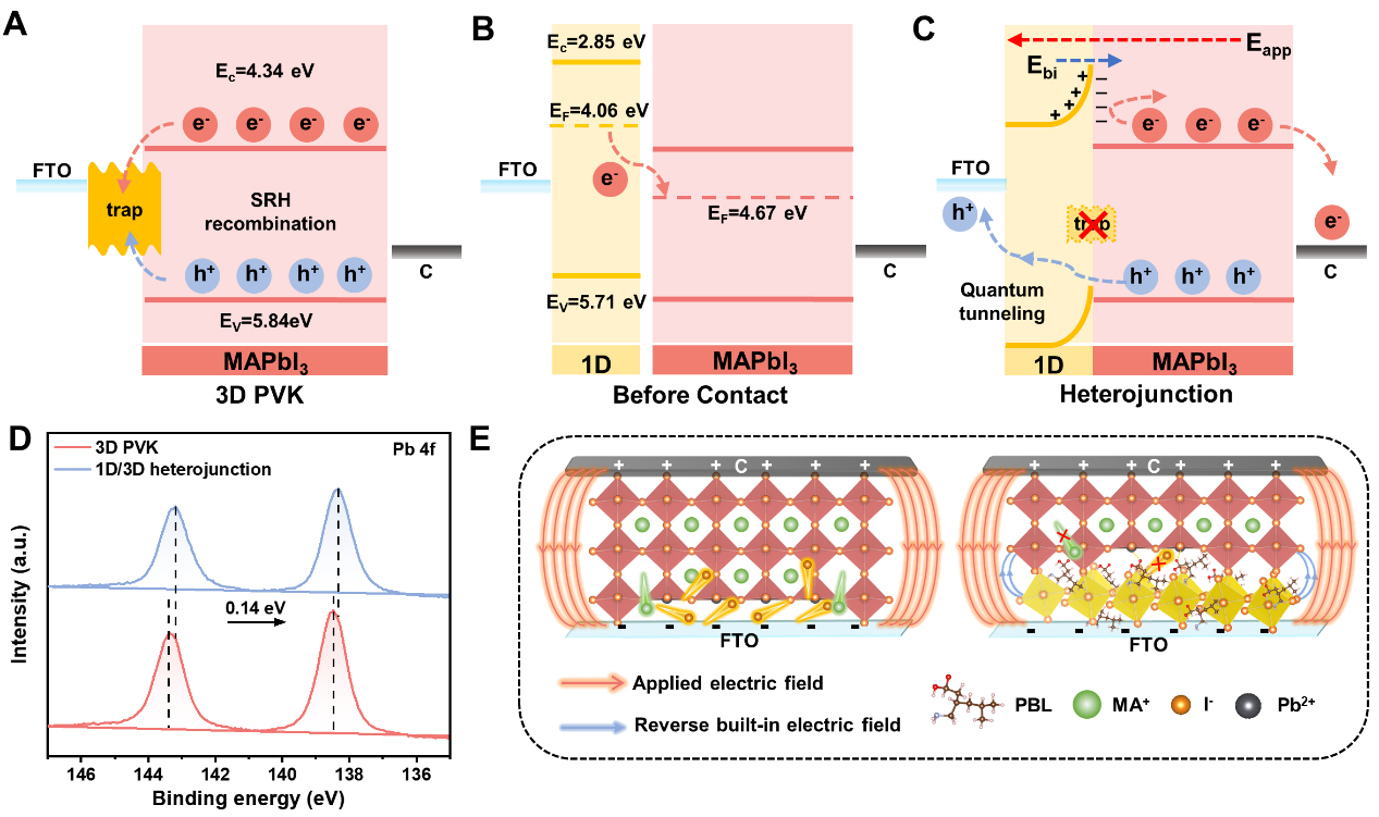 针对上述问题,研究团队设计并合成了一种新型1D钙钛矿材料——(PBL)4PbI6(PBL+为普瑞巴林离子)。该材料具备以下三个特征:(1)(PBL)4PbI6可溶于低极性溶剂乙酸乙酯,这一特性有助于减少溶剂残留对后续上层钙钛矿厚膜质量的影响。(2)(PBL)4PbI6与三维钙钛矿MAPbI3之间具有高晶格匹配度,晶格失配度仅为~1.3%,有利于上层3D钙钛矿高质量的外延生长,从源头上减少界面处的结构缺陷(图1)。(3)能带结构分析表明,(PBL)4PbI6与MAPbI3形成I型异质结,在异质结处产生由3D层指向1D层的内建电场。该内建电场方向与器件工作时施加的外加电场相反,可在界面区域部分抵消外加电场强度,从而有效抑制电场驱动下的离子迁移行为(图2)。