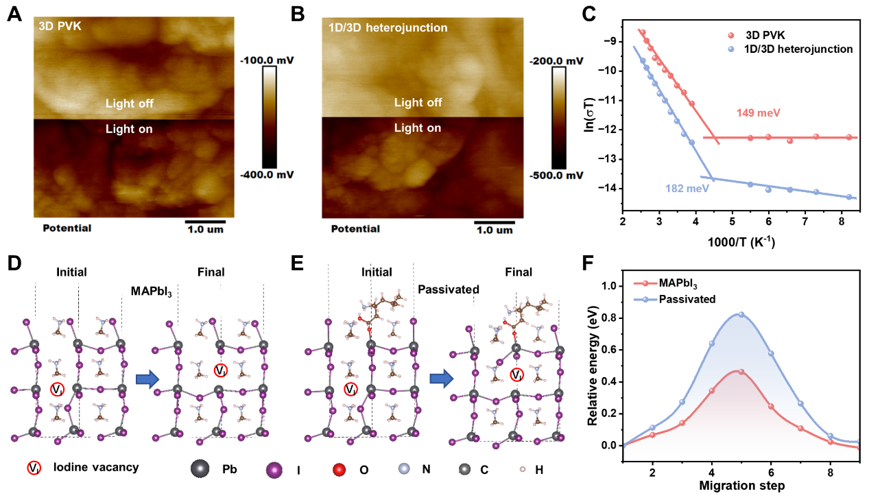 表面光电压测试显示,异质结厚膜在光照下表现出更强的表面光电压响应信号(从83 mV增加至123 mV)。结合变温电导率测试和密度泛函理论计算对离子迁移行为进行系统分析:得益于(PBL)4PbI6界面层的引入,厚膜中表观离子迁移的活化能从149 meV增加到182 meV;该能垒升高现象在DFT计算中获得一致验证。计算显示,PBL+局域环境显著增强了I-迁移路径上的能量势垒,从而在热力学与动力学双重维度抑制离子迁移。
