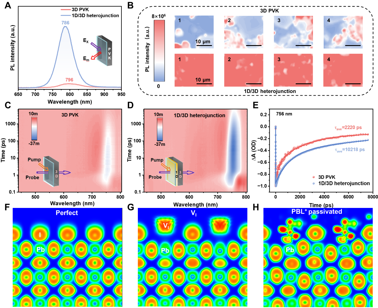 瞬态吸收光谱表征发现,引入1D/3D异质结构后,3D钙钛矿的平均载流子寿命由2,220 ps延长至10,218 ps,证实界面异质结的构建有效地钝化底界面缺陷并抑制载流子复合(图3)。