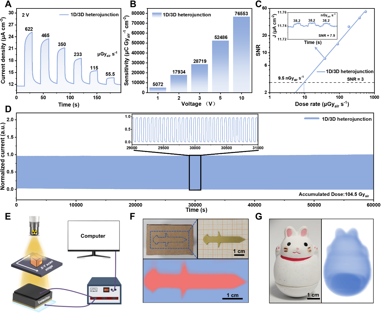 图5:1D/3D异质结器件的X射线探测与成像性能。