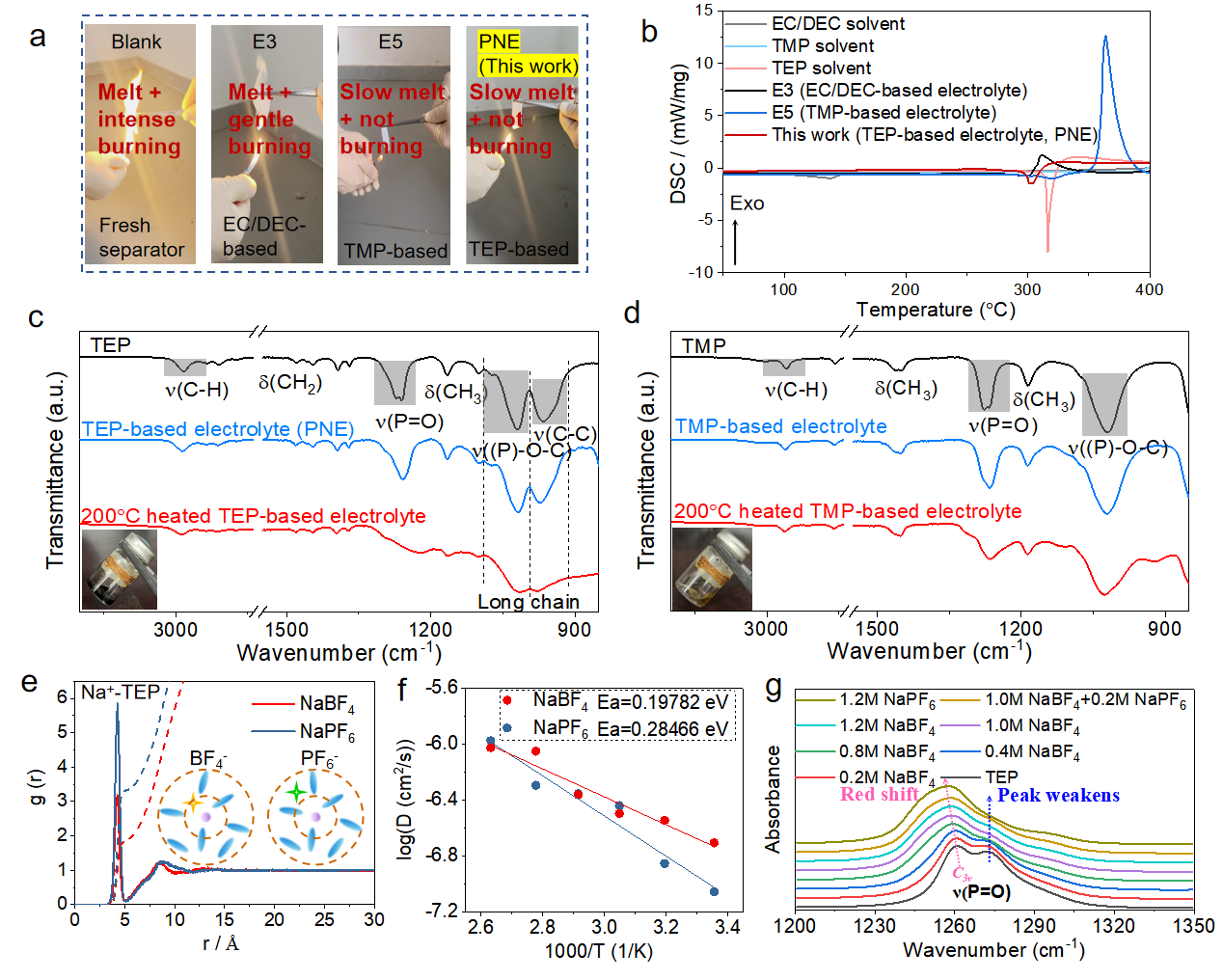图1:PNE(可聚合不燃电解质)的特性。a, 新鲜隔膜以及分别浸泡在碳酸乙烯酯/碳酸二乙酯基电解液(E3)、磷酸三甲酯基电解液(E5)和磷酸三乙酯基电解液(PNE)中的隔膜的点火实验。b, 上述电解液及对应溶剂的差示扫描量热法(DSC)测试。c, TEP(磷酸三乙酯)溶剂、PNE以及经200℃加热后PNE的傅里叶变换红外(FTIR)光谱。内嵌图片为200℃加热后的PNE。d, TMP(磷酸三甲酯)溶剂、E5以及经200℃加热后E5的傅里叶变换红外(FTIR)光谱。内嵌图片为200℃加热后的E5。e, 溶解有NaPF6或NaBF4的TEP中,Na+与TEP的径向分布函数(RDF)及相应的配位数(DN)。内嵌图展示了第一溶剂化壳层的结构排列。f, 在基于TEP的电解液中,Na+在NaPF6或NaBF4体系中的去溶剂化活化能(Ea)。g, 不同浓度的TEP基电解液的红外吸收光谱。