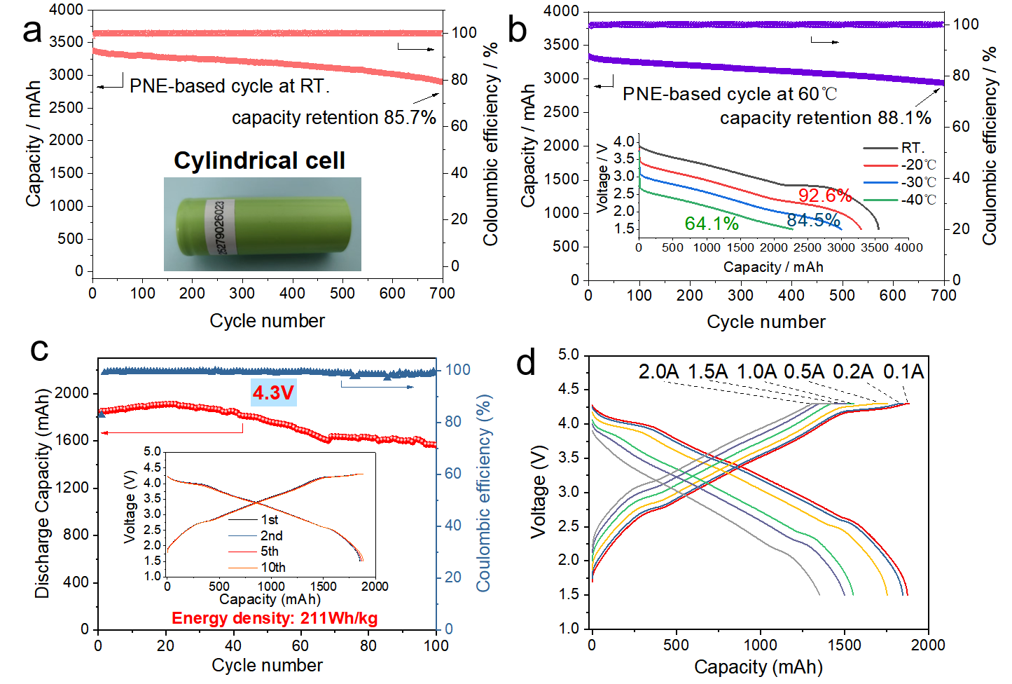 图3:圆柱形电芯的电化学性能。a, PNE电解液基的O3-NaCu1/9Ni2/9Fe1/3Mn1/3O2//硬碳(HC)26700圆柱形电芯在室温(RT.)下的循环性能。b, 该电芯在60℃以0.5C(1C=3.5 A)电流测试的循环性能。图3b中的内嵌图代表在室温下充电低温下以0.2C(1C = 3.5 A)电流放电的放电曲线。c, 18650圆柱形电芯在1.5-4.3 V之间的循环性能。图3c中的内嵌图代表相应的充放电曲线。d, 18650圆柱形电芯在1.5-4.3 V之间的倍率性能。